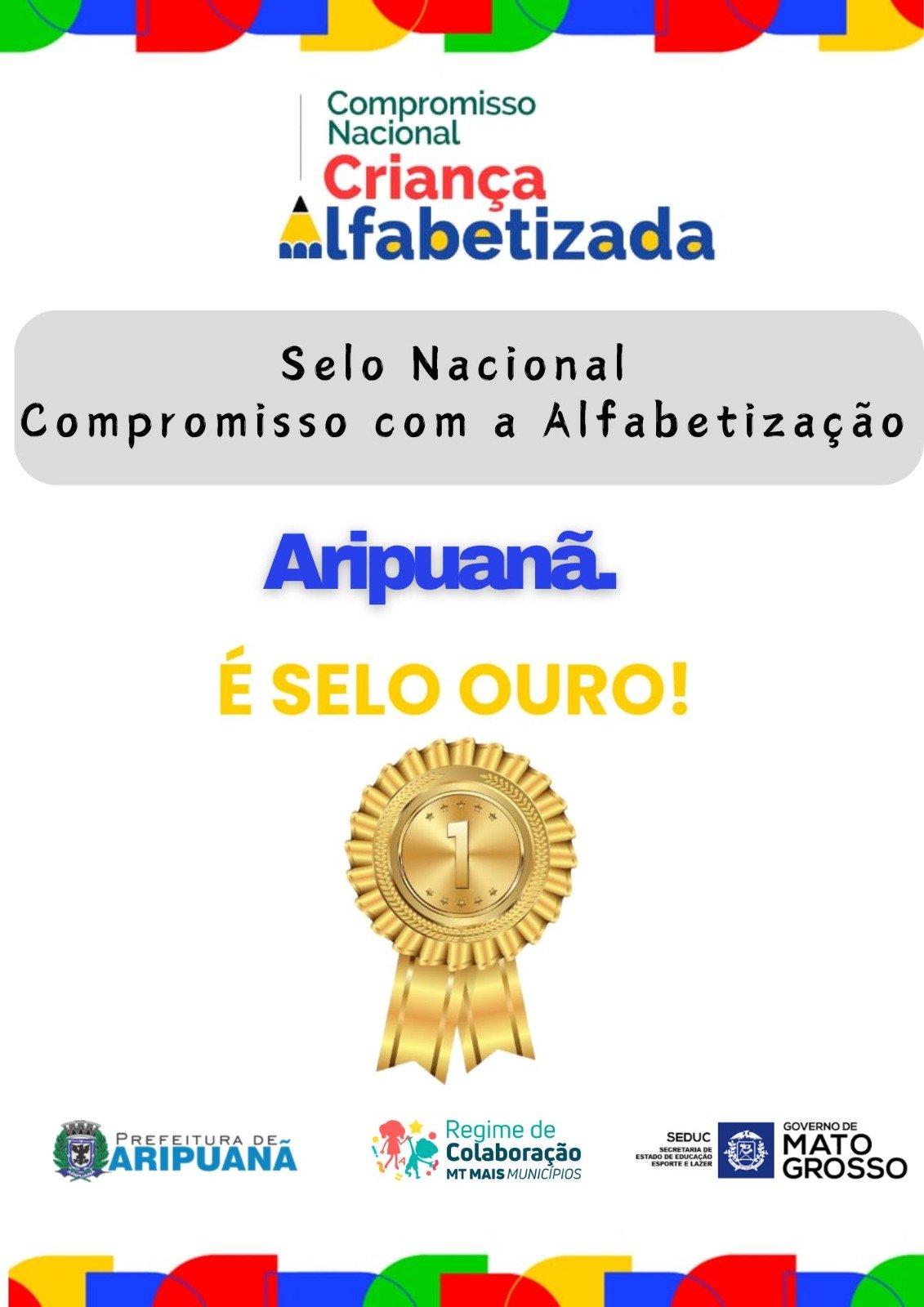 A Rede Municipal de Educação de Aripuanã conquistou a categoria Ouro do Selo Nacional Compromisso com a Alfabetização, promovido pelo Ministério da Educação (MEC). Esse reconhecimento destaca o trabalho de excelência no campo da alfabetização, consolidando o município como referência em iniciativas pedagógicas na educação infantil e nos anos iniciais do ensino fundamental.