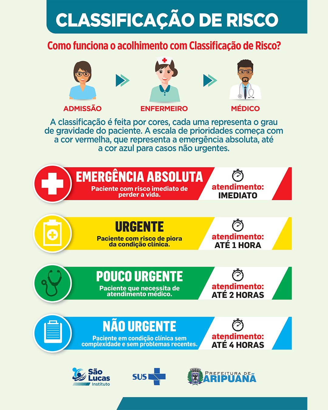 A Prefeitura de Aripuanã, por meio da Secretaria Municipal de Saúde, reforça à população a importância da organização dos atendimentos no Hospital Municipal Santo Antônio, com base na Classificação de Risco. O objetivo é garantir agilidade, eficiência e um cuidado mais humanizado para quem realmente precisa de atendimento de urgência e emergência.