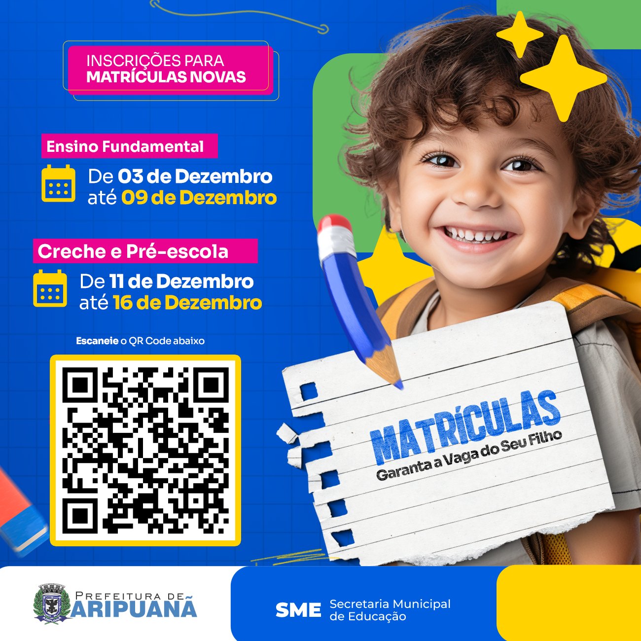 As inscrições para novos alunos serão realizadas de forma online entre 3 e 9 de dezembro de 2024 para o ensino fundamental, e de 11 a 16 de dezembro para creches e pré-escolas. Os interessados deverão entrar pelo link CLIQUE AQUI PARA REALIZAR A MATRÍCULA