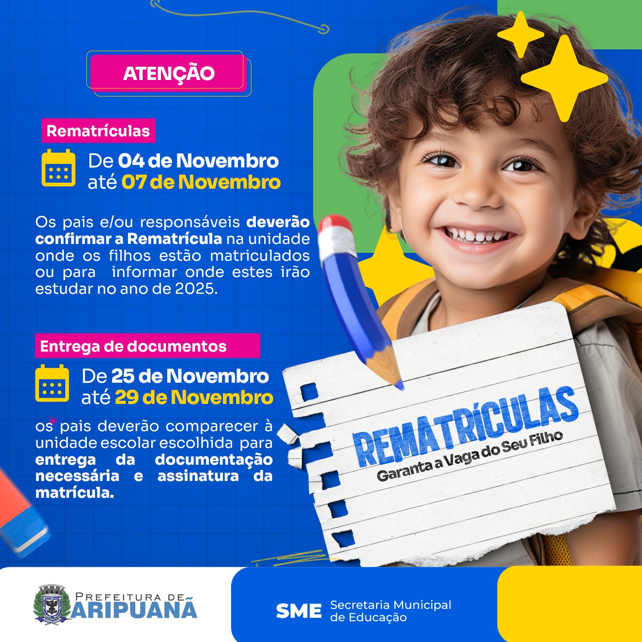 A Secretaria Municipal de Educação, anunciou a abertura do período de rematrículas e matrículas novas para o ano letivo de 2025, conforme a Portaria Nº 1.234/2024. As inscrições terão início no dia 4 de novembro e seguem até 16 de dezembro de 2024, contemplando estudantes da educação infantil e ensino fundamental.